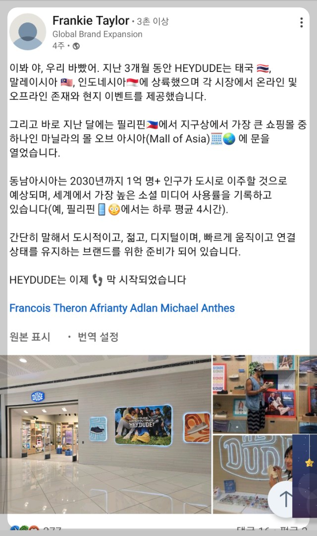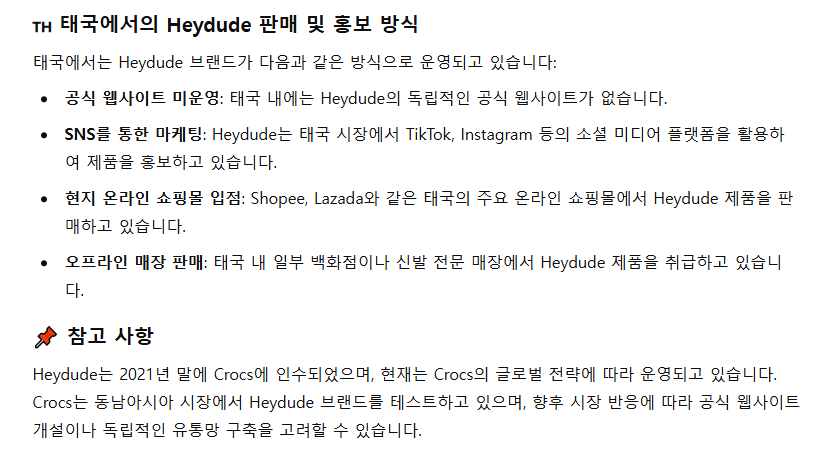 미국에서 시작한 크록스도 전 세계로 퍼진 것처럼 헤이듀드도 글로벌 브랜드로의 발걸음을 조금씩 내딛고 있는 것 같다. 틱톡에서 헤이듀드를 검색해보니, 태국의 몇몇 인플루언서들이 헤이듀드 신발을 멋지게 홍보하고 있는 쇼츠들을 볼 수 있었다.