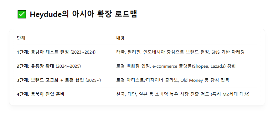 헤이듀드가 작년 하반기부터 동남아시아 확장 전략을 시작한 것 같다. 혹시 최악의 경우에 헤이듀드가 미국에서 성공하지 못하더라도, 아시아, 남미에서 성공하면 어떨까 하는 생각을 했었다. 아시아, 동남아시아 소비자들 입장에서는 미국에서 건너온 처음보는 브랜드가 신선하고 멋져보일 수 있다고 생각했기 때문이다.(미국물)