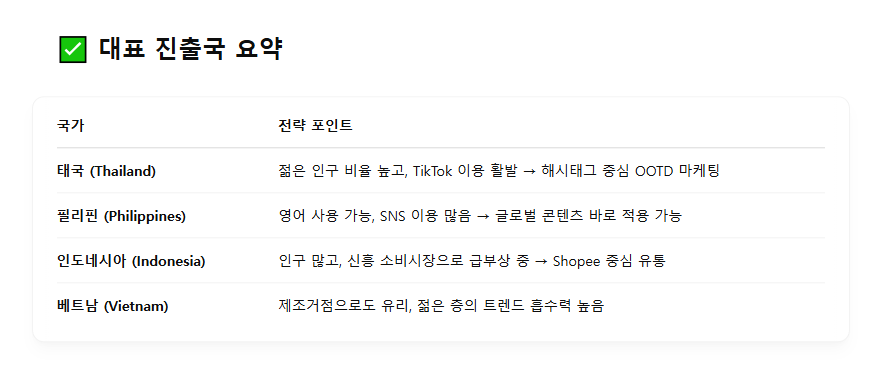 아직 태국, 말레이시아, 인도네시아, 필리핀 전용 홈페이지는 없다. 하지만 틱톡, 인스타그램을 통한 매출 전략을 구상한 것 같다. 태국은 틱톡과 인스타그램 이용율이 매우 높은 국가라고 한다. 태국의 소득수준은 낮지만 중산층 이상은 꾸준히 증가하고 있으며, 특히 젊은층의 소비 욕구와 글로벌 브랜드에 대한 선호도가 상당히 높고, 2~30대 MZ세대의 패션 소비 지출이 증가하고 있다고 한다.(가성비+트렌디함+글로벌브랜드)